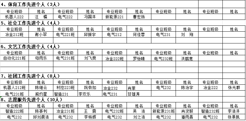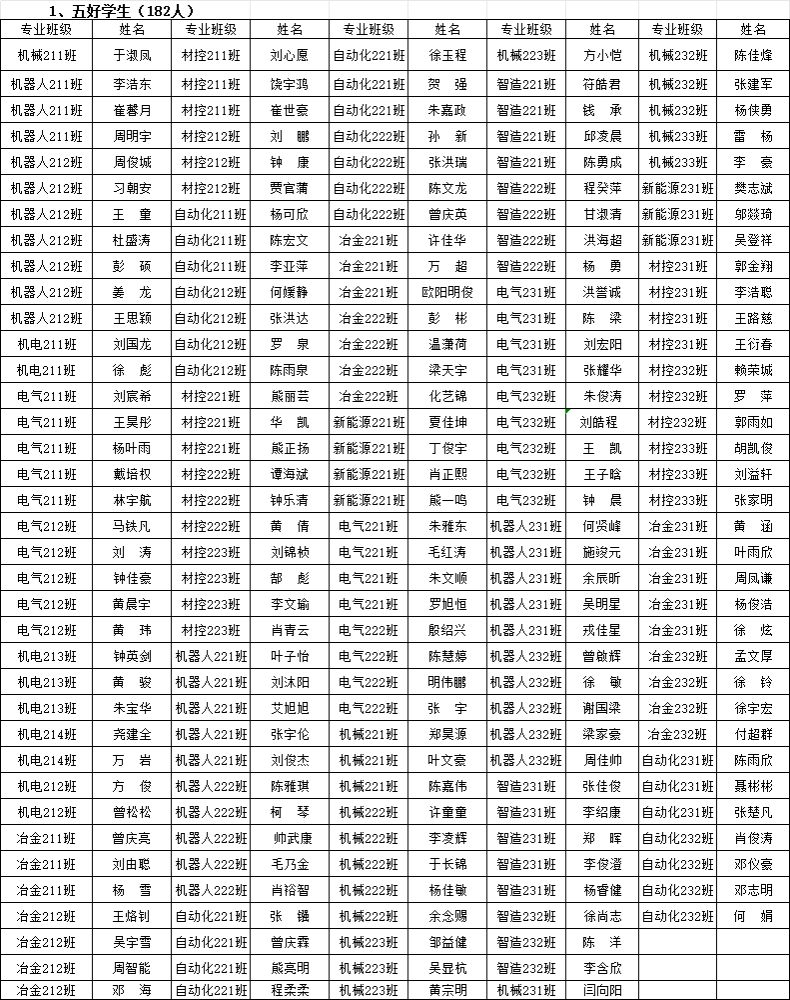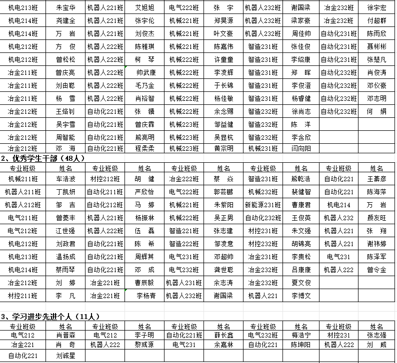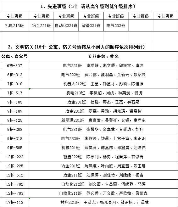 本网讯:根据学校《关于做好2023-2024学年学生先进集体、先进个人评选工作的通知》文件要求,经学生本人申请、班级认定评议小组评议、学院认定评审领导小组审定,拟确定机电213等5个班级获得先进班级称号,6栋307等16个寝室获得文明宿舍称号,于淑凤等370名学生获得先进个人称号。现予以公示,公示期为:2024年11月15日到11月17日,公示三天。如有异议,请在公示期内与学院反映。