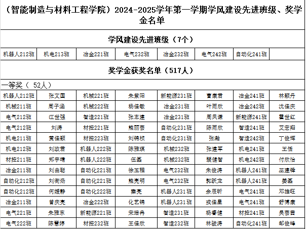 本网讯:根据学校《关于做好2024-2025学年第一学期学生综合素质测评及学生综合奖学金评定工作的通知》文件要求,按照《pp电子游戏平台网站学风建设先进班级实施办法细则补充(试行)》和《pp电子游戏平台网站学生综合素质测评评定补充细则(试行)》有关规定,经学生本人申请、班级认定评议小组评议、学院认定评审领导小组审定,拟确定机器人212等7个班级获得学风建设先进班级称号,张文国等517名学生获得综合奖学金。现予以公示,公示期为:2025年3月19日到3月21日,公示三天。如有异议,请在公示期内与学院反映。(附件:pp电子游戏平台网站2024-2025学年第一学期学风建设先进班级和奖学金汇总表)