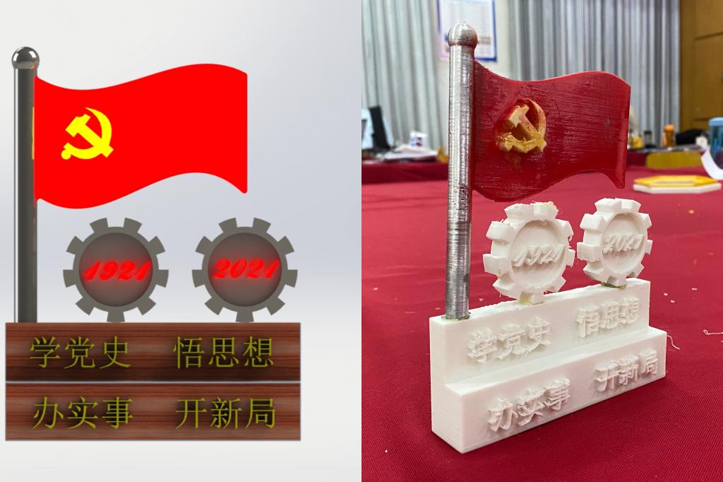 在这次比赛充分涌现出许多体现“红色精神”主题的作品,其中机械201班徐佳仪同学介绍说,她所设计的《高举党的100周年旗帜》作品,更是把专业与红色精神相结合,用机械专业重要传动零部件来表示100数字,两个数字“〇”创新性用两个齿轮表示,前面的党的旗帜代表数字“1”用轴来表达,体现了中国制造向中国创造升级,为中国共产党建党100周年献礼,创意满满。