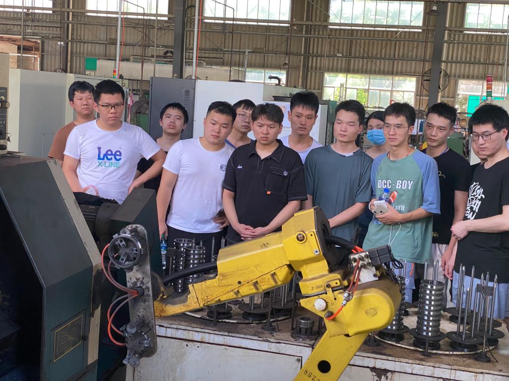 随后,在生产部陆工的带领下,同学们在生产现场参观了机器人在上下料、车削、倒角、工件翻转、拉削、中频感应淬火等工序中各机器人的结构特点、工作原理,进一步了解了机器人的实际应用场景。