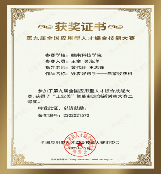 经过激烈角逐,pp电子有三个队伍在比赛当中获得了优异的成绩,王童、吴海洋等同学组成的队伍,在”工业美“项目中荣获二等奖。他们的作品为“兴农好帮手——白菜收割机”、除此之外还有两个队伍也分别获得了“工业美”智能制造创新创意大赛二等奖,这些获奖队伍充分展示了pp电子学生在专业领域的深厚造诣和创新能力。此外,pp电子还有多个团队和学生在其他比赛项目中也取得了优异的成绩,为学校赢得了广泛的赞誉。