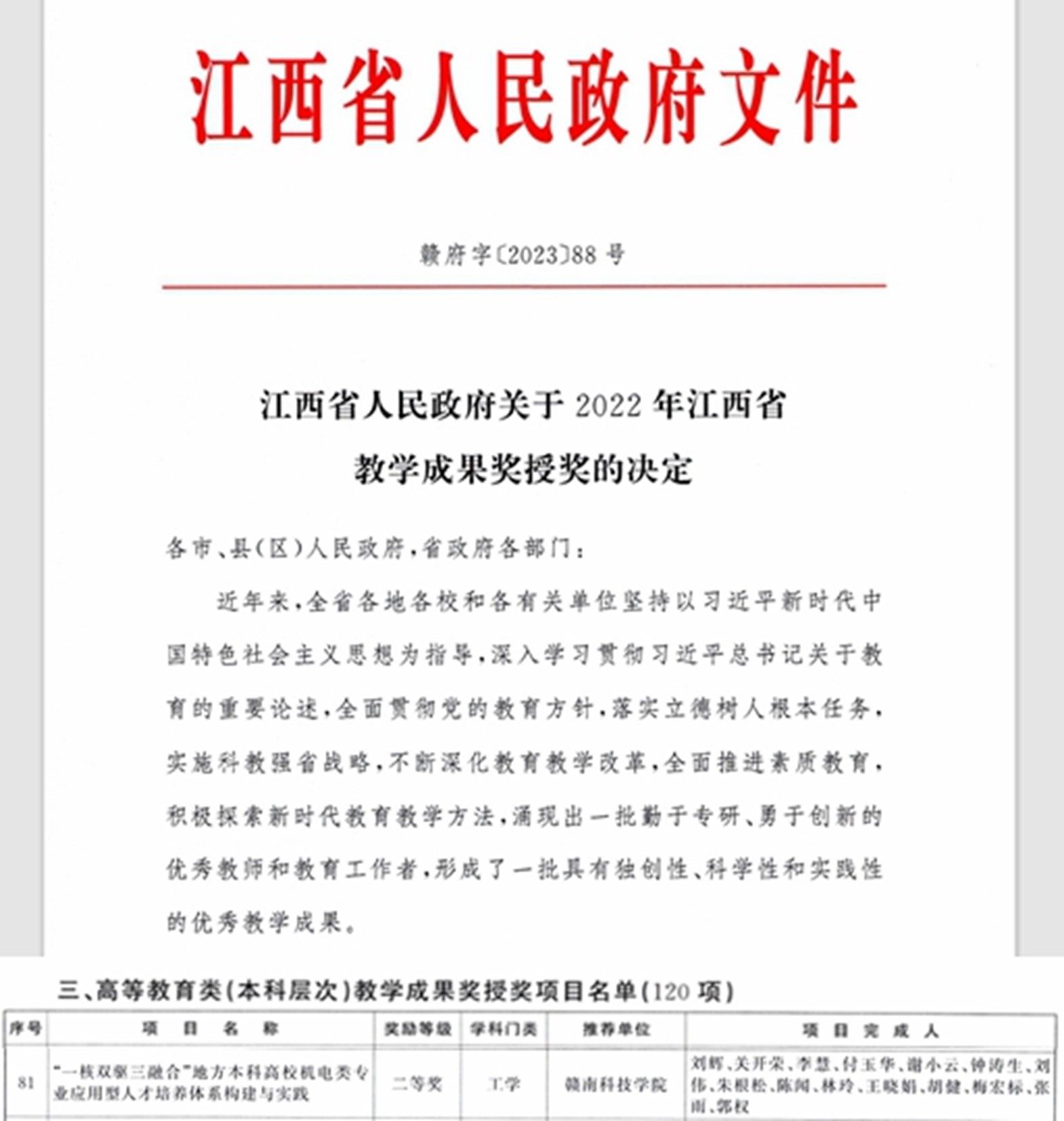 本网讯:近日,为表彰教学领域的先进典型,发挥教学成果的引领激励作用,省政府决定授予350项教学成果为2022年江西省教学成果奖。其中,pp电子《“一核双驱三融合”地方本科高校机电类专业应用型人才培养体系构建与实践》项目喜获高等教育类(本科层次)教学成果奖二等奖。