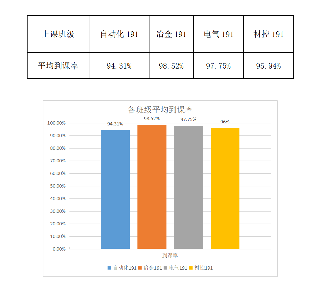 从数据来看冶金191班到课率较高,表现良好,希望能够继续保持!