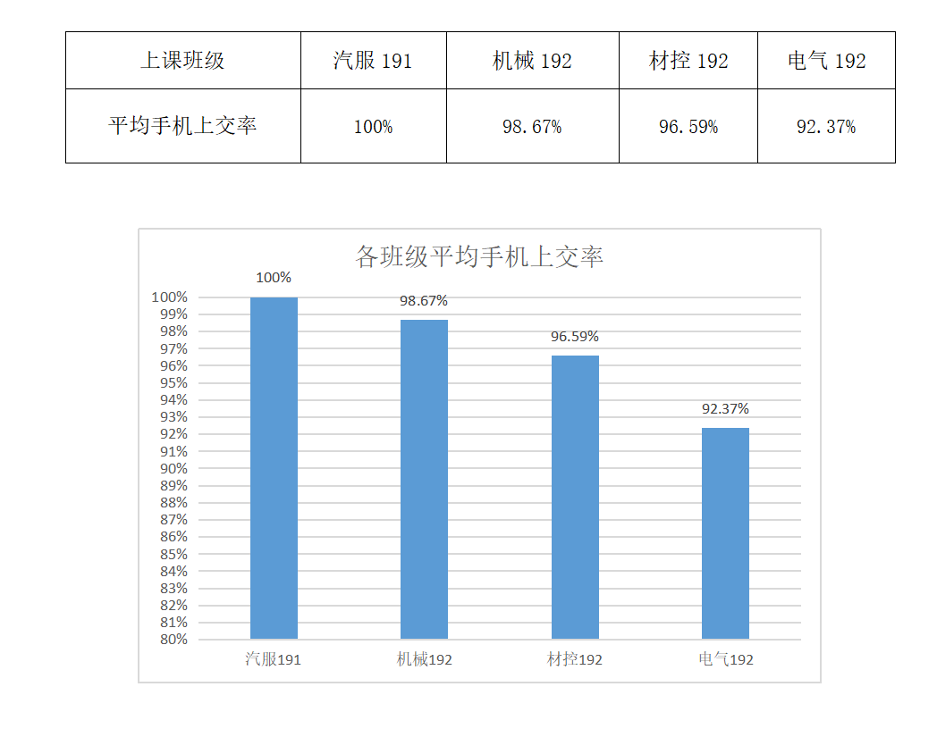 从数据来看汽服191班同学手机上交率较高,表现良好,希望能够继续保持