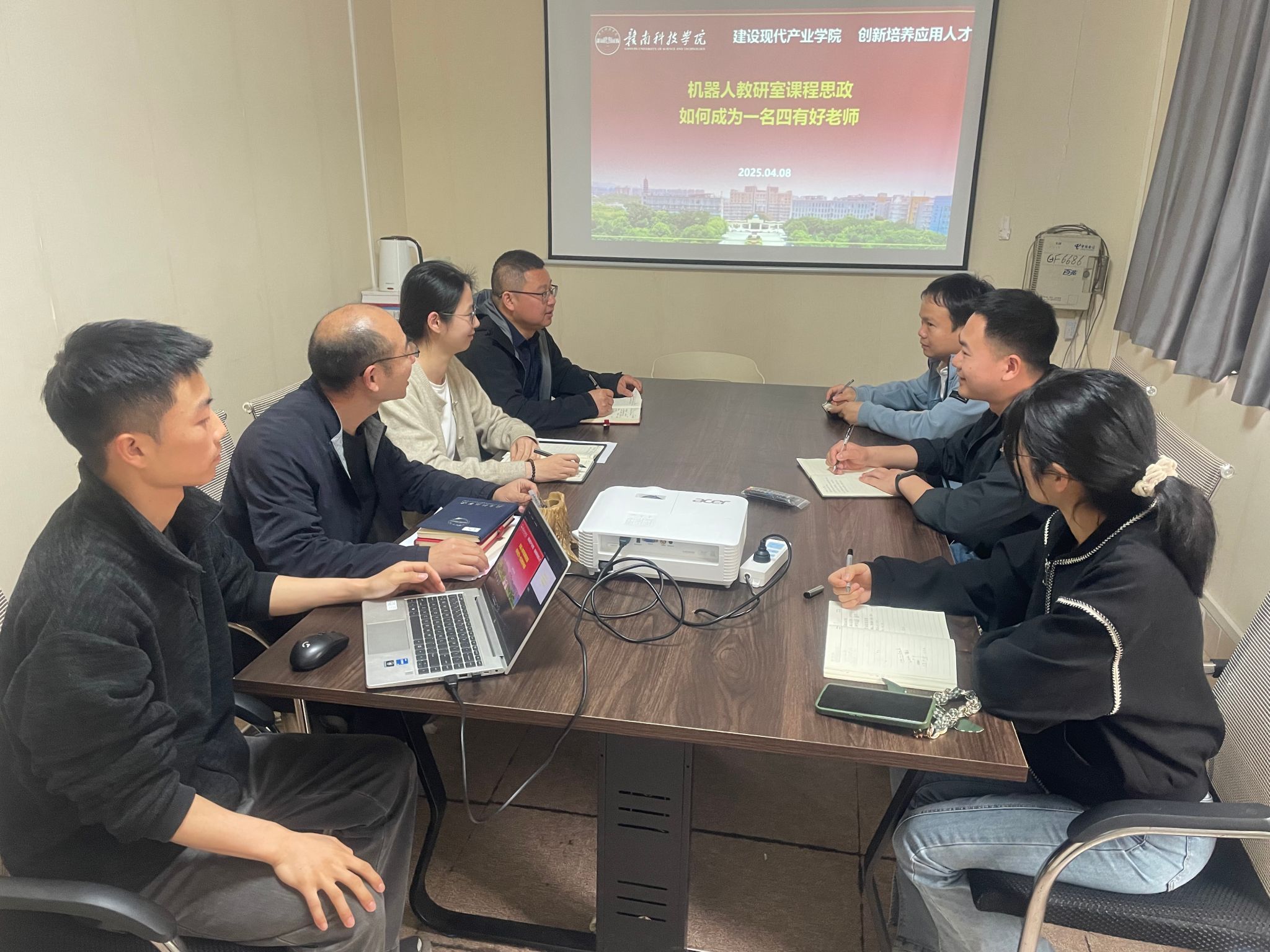 本网讯:4月8日,pp电子游戏平台网站机器人教研室以“如何成为一名四有好老师”为主题,成功举办课程思政专题研讨会。本次研讨会聚焦新时代教师队伍建设要求,深入探讨如何在机器人专业教学中践行“有理想信念、有道德情操、有扎实学识、有仁爱之心”的育人理念,为新工科人才培养注入思政内涵。