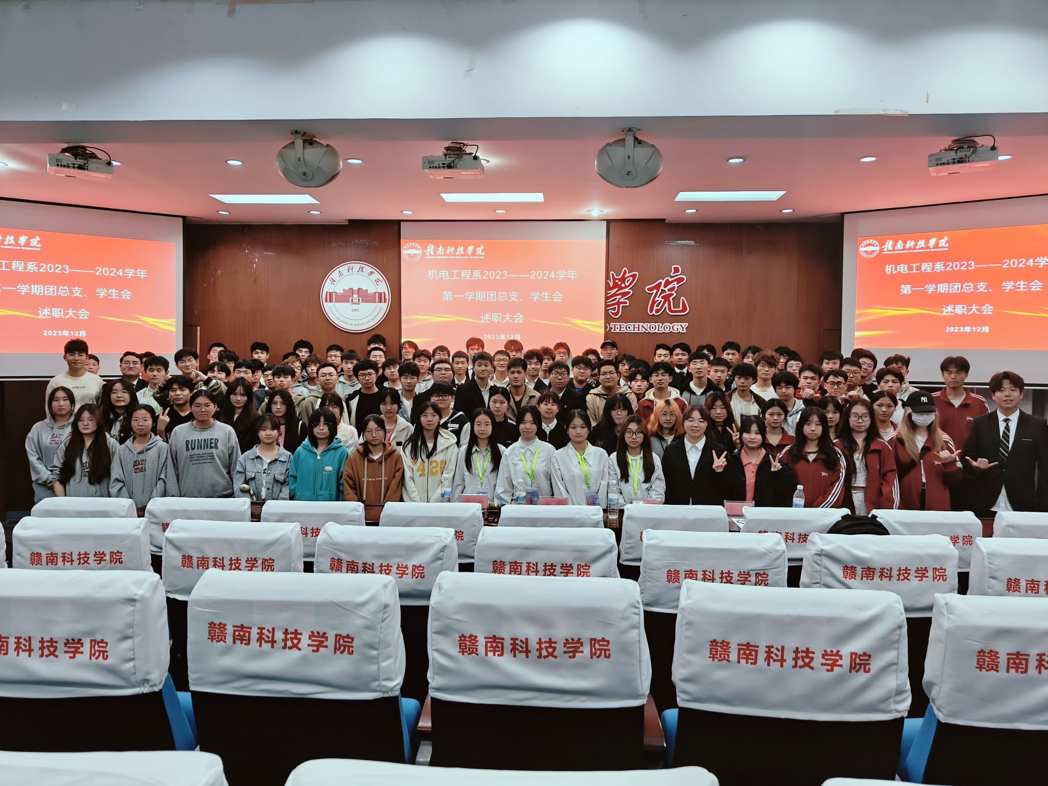本网讯:2023年12月10日下午,机电工程系于新民楼报告厅开展机电工程系2023——2024学年第一学期团总支、学生会学生干部述职大会。本次述职大会围绕我系团总支、学生会各部门在本学期工作中的收获与不足进行汇报问答,总结过去,展望未来。机电工程系团总支书记卢名亮老师、机电工程系主席团三位主席作为评委嘉宾出席本次会议,机电工程系团总支、学生会全体成员参加此次述职大会。